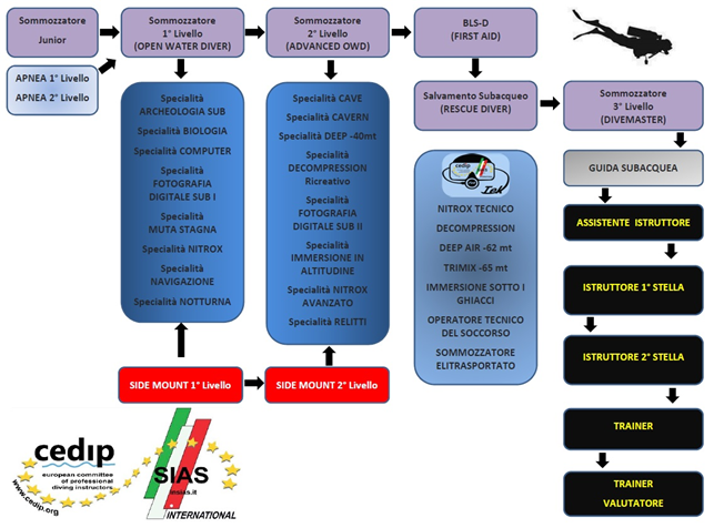 L’apertura a una serie di specializzazioni siamo convinti sia una delle armi vincenti per consentire ai nostri giovani subacquei un percorso più interessante, consentendoci l’organizzazione di immersioni e crociere in cui coinvolgerli, come didattica ci stiamo impegnando per fornirvi tutta la manualistica necessaria alla formazione dei nostri allievi. Avrete certamente notato come dal piano formativo si rafforzi la figura del “Sommozzatore 3a Stella” (Dive Leader), per l’appartenenza ai gruppi di Protezione Civile le istituzioni hanno espressamente richiesto che la qualifica del personale operativo venga svolga da questo traguardo, a tale scopo abbiamo stretto accordi per consentire ina qualifica professionalmente riconoscibile in ambito locale creando corsi formativi per: